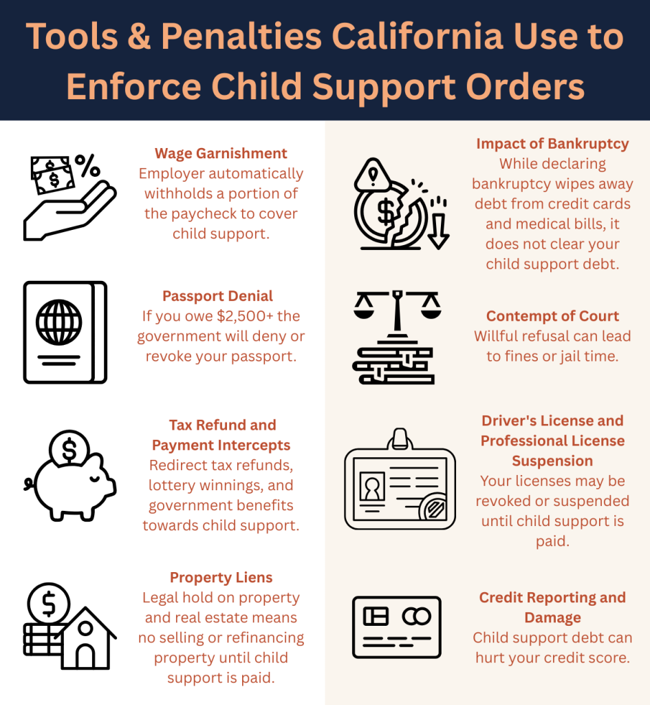 California’s local and state child support agencies help enforce orders at no direct cost to you. They can help collect arrears, garnish wages, intercept tax refunds, put liens on property, or sometimes suspend licenses until payments resume.